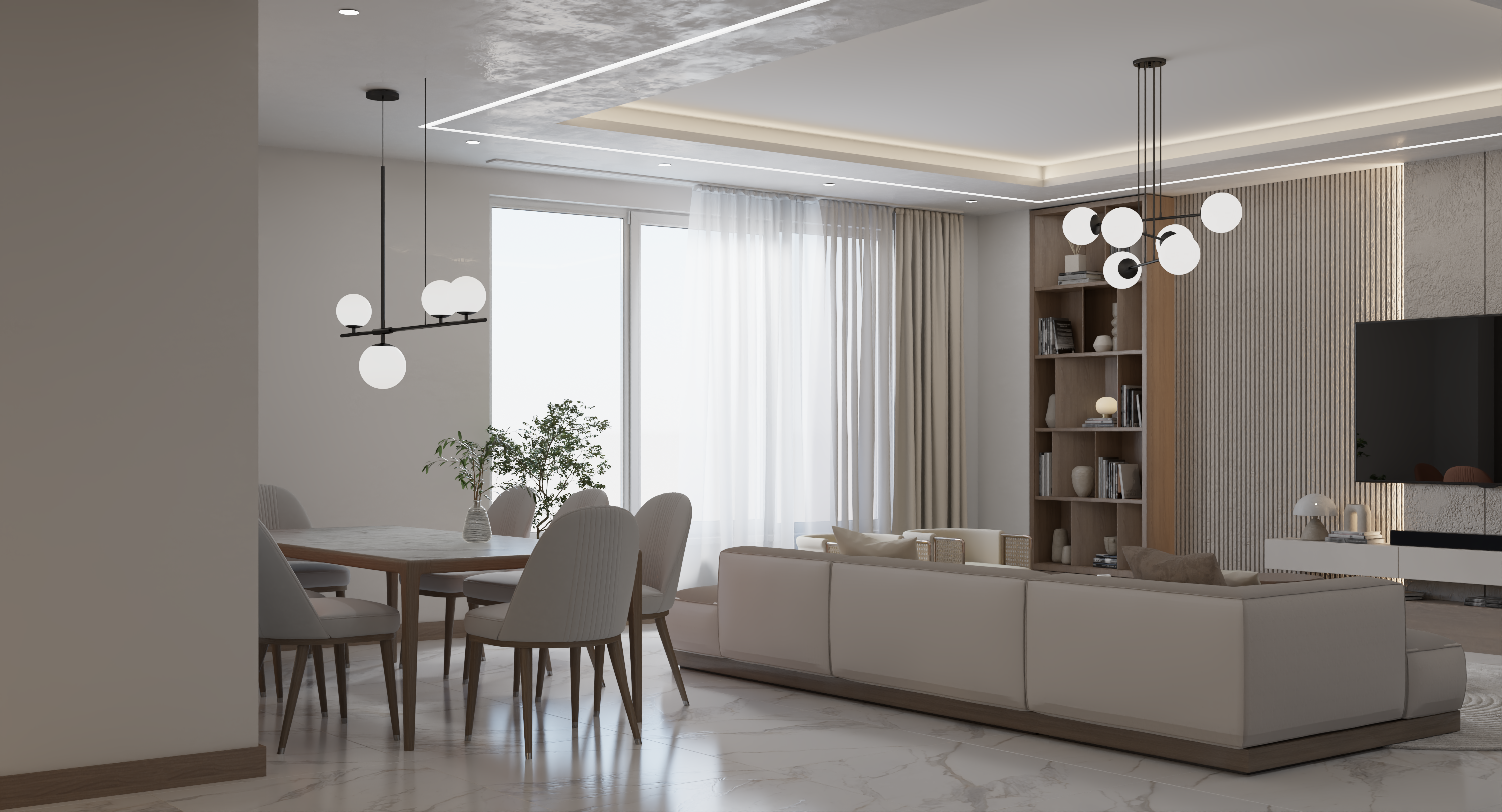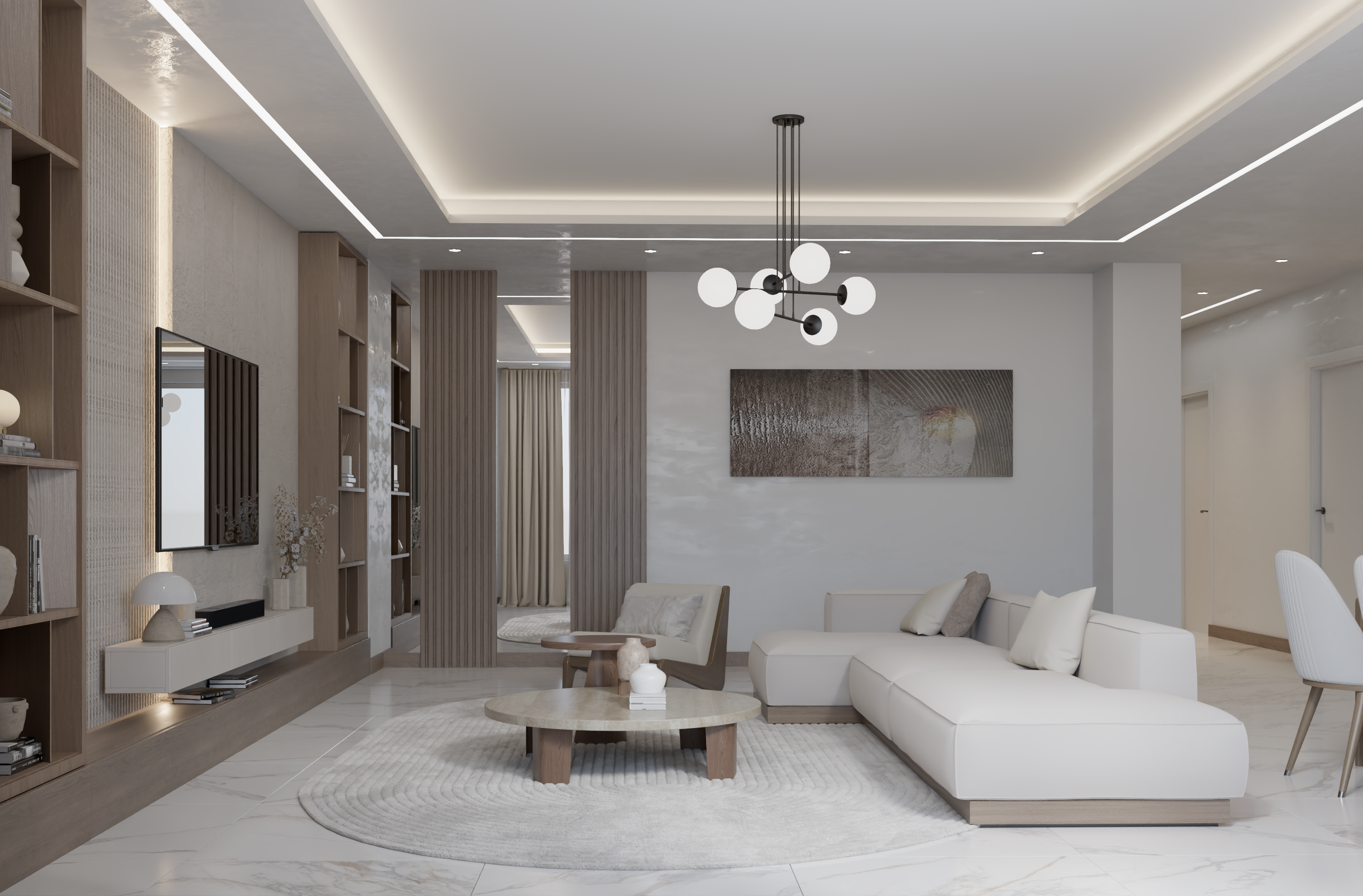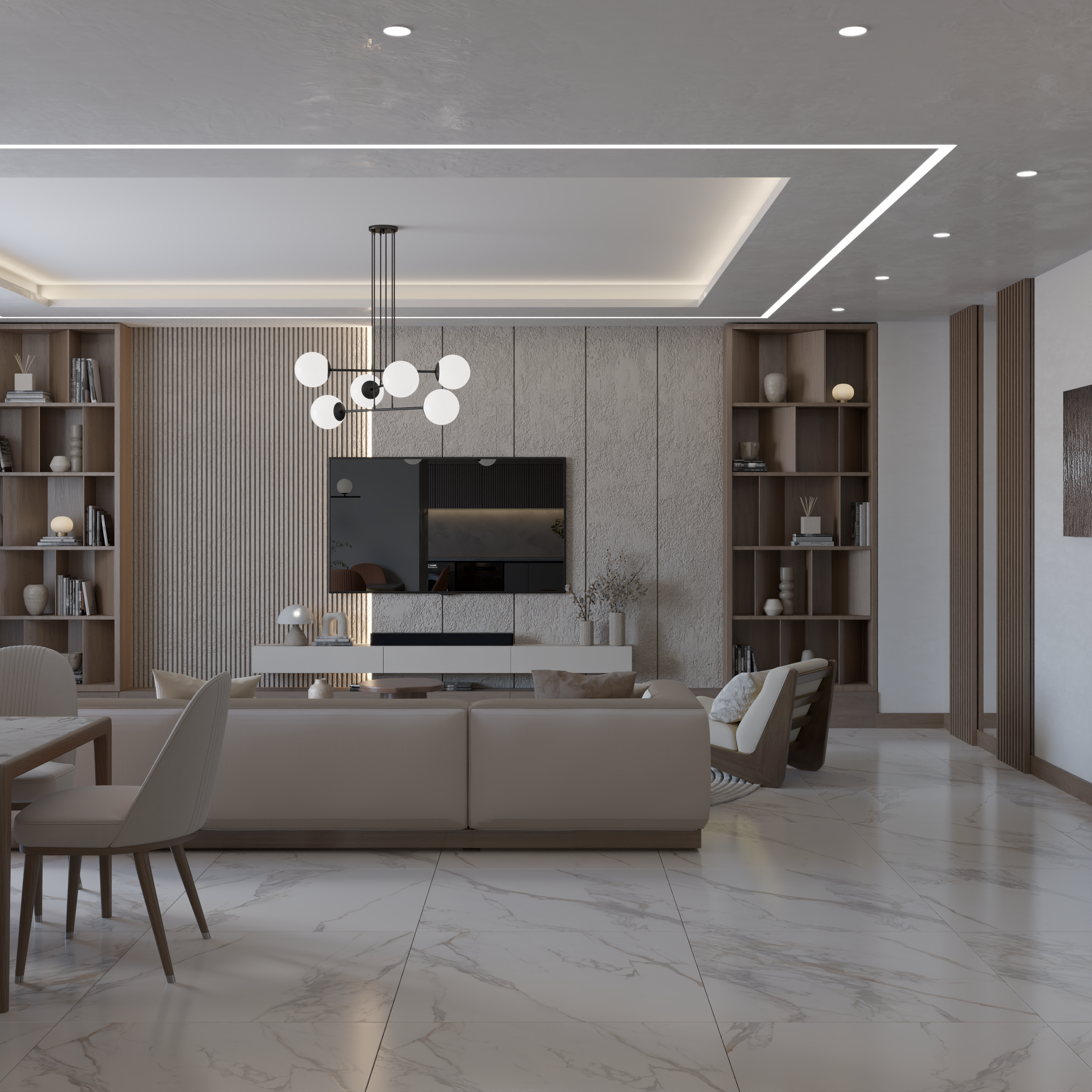 Living Room: A standout feature is the TV wall finished with microcement, flanked by two floor-to-ceiling bookshelves adorned with grooved wood panels. The use of sheer and heavy curtains adds texture and depth.