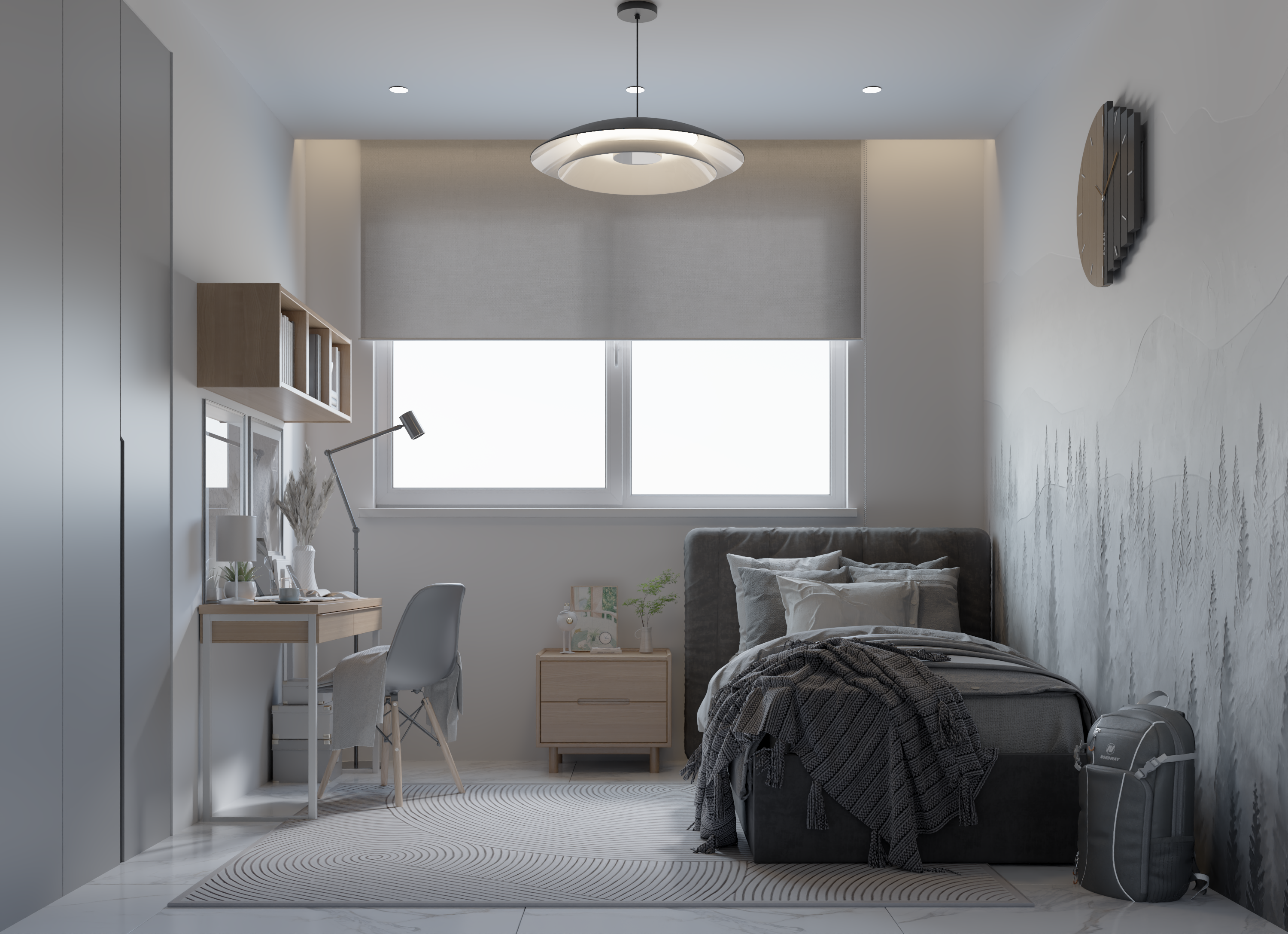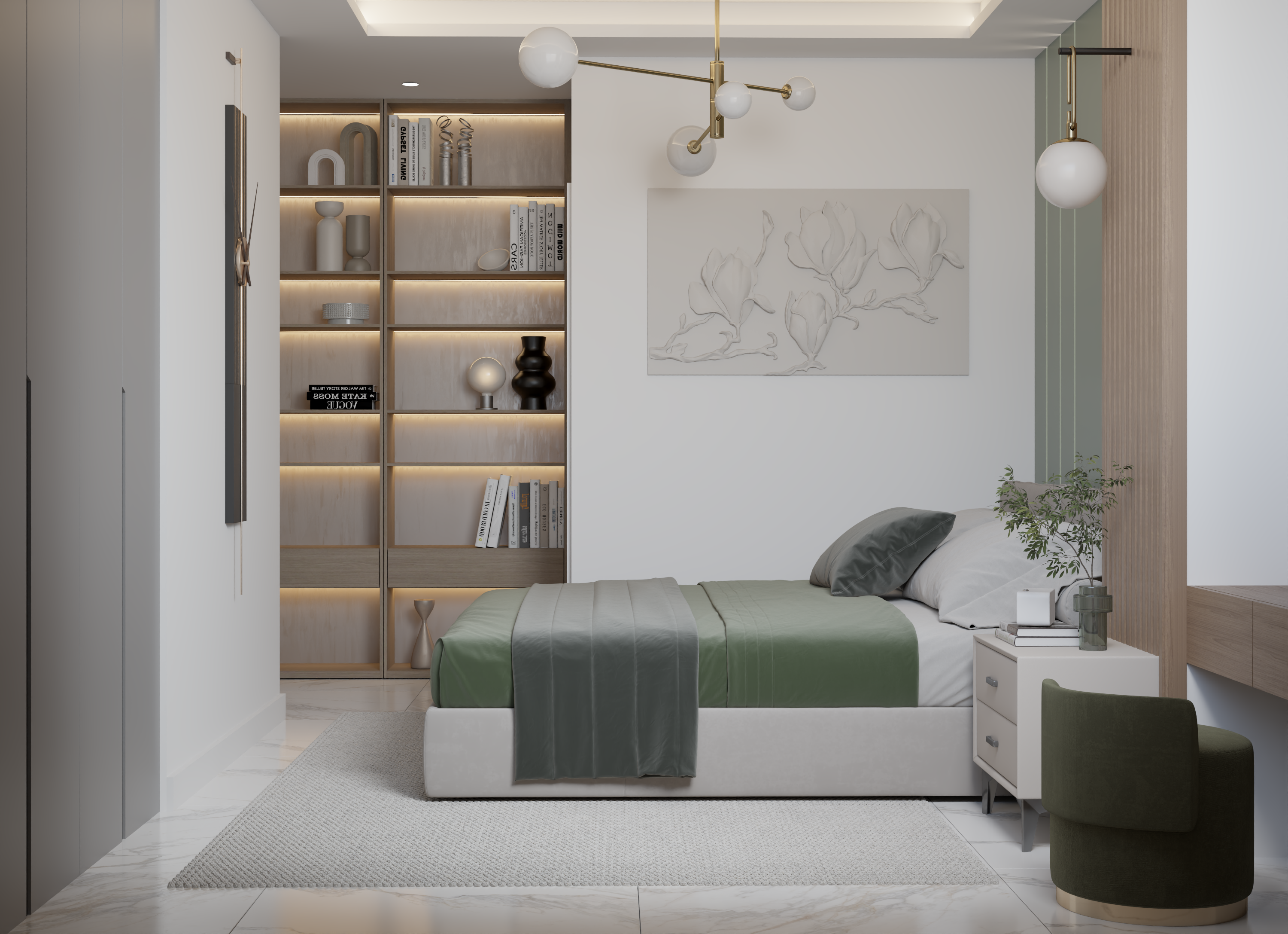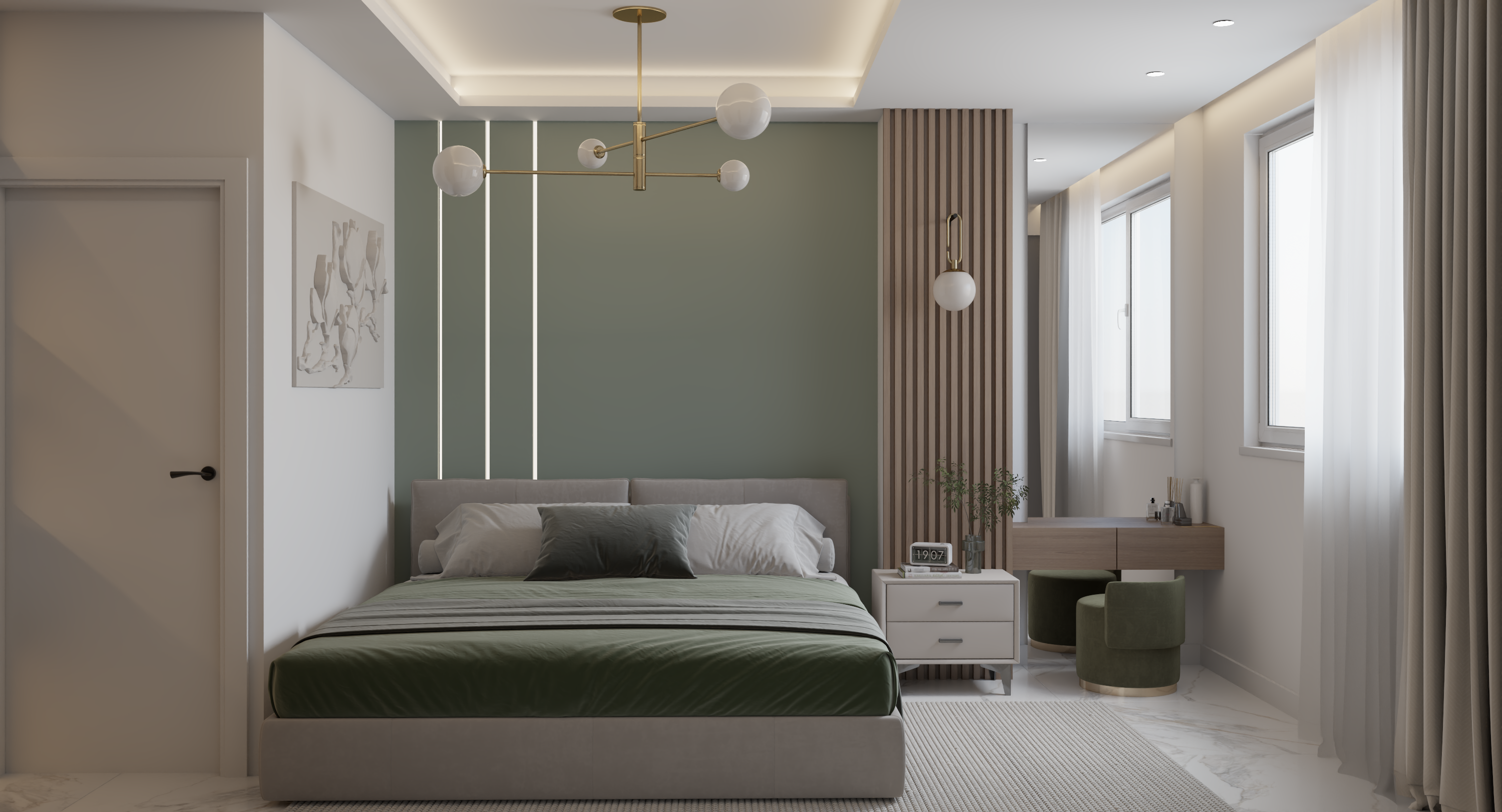 Living Room: A standout feature is the TV wall finished with microcement, flanked by two floor-to-ceiling bookshelves adorned with grooved wood panels. The use of sheer and heavy curtains adds texture and depth.