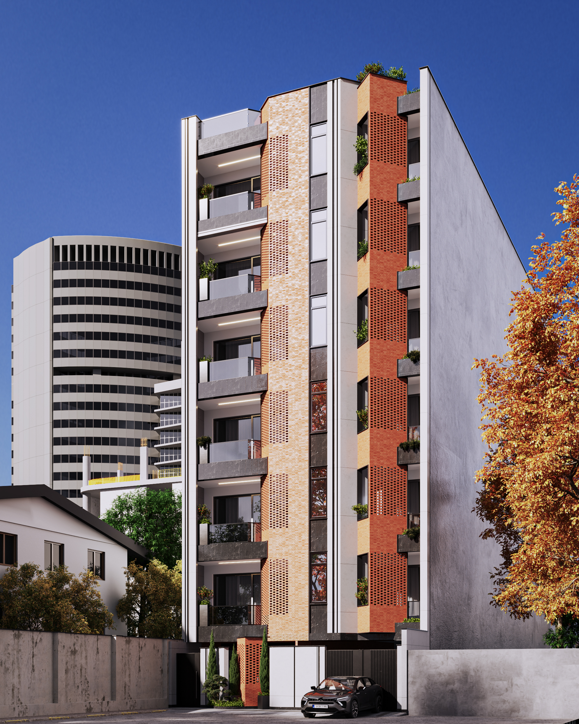 در طراحی نما، خطوط عمودی و شکستهای حجمی بهگونهای به کار رفتهاند که بر ارتفاع و کشیدگی ساختمان تأکید بصری داشته باشند، بدون آنکه انسجام کلی از بین برود. این رویکرد باعث شده نمای ساختمان در عین سادگی، هویتی قوی و معماریمحور داشته باشد — فضایی فراتر از متراژ و نقشه، و پاسخی به نیاز به آرامش، کیفیت و معنا در زندگی روزمره.