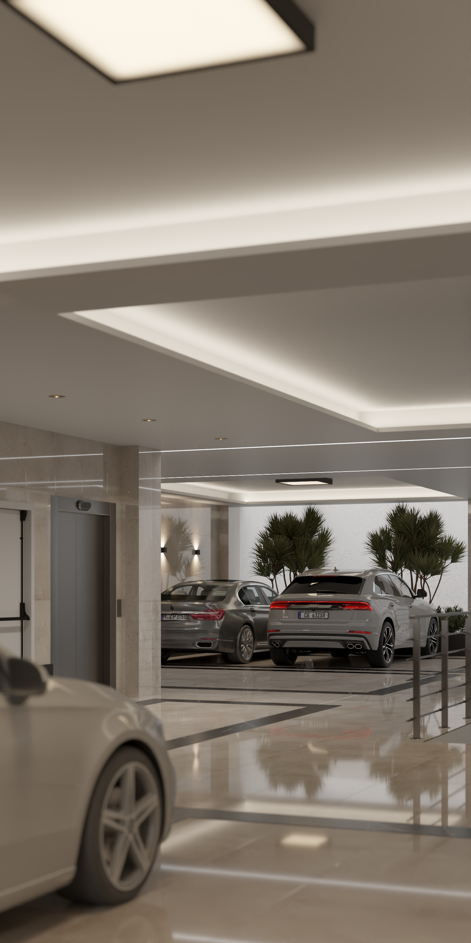 فضای پارکینگ با متریال مقاوم و باکیفیت اجرا شده تا دوام، امنیت و زیبایی را همزمان تأمین کند. مسیر ورود به لابی از پارکینگ کاملاً مستقل طراحی شده، اما ارتباط مستقیم میان این دو فضا حفظ شده است. هر واحد دارای جای پارک اختصاصی و بدون مزاحمت است تا آسایش ساکنین در تردد روزمره تضمین شود.